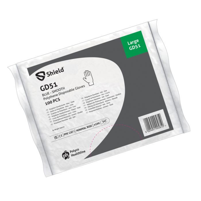 GD51 Shield® Blue Smooth Polythene Disposable minimal risk gloves are packed in a poly bag for easy dispensing. These gloves are latex free, reducing the risk of hypersensitivity and allergic reactions. Smooth, flexible material is designed to enhance both feel and fit, ensuring reduced fatigue even during extended wear.